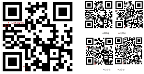 二维码纠错示意图:关键部分已用红色框框出来,识别方向也已用箭头标示。假定黑色块为1,白色为0,那么:两黑色块平列,黑+黑=11,容错率为L,黑+白=10,位M级容错;白+黑=01,为Q级容错;白+白=00,为H级容错。如图所示: