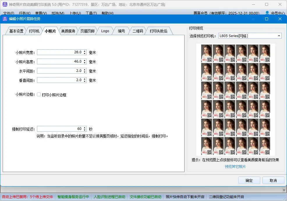小照片设置:支持设置小照片宽度、高度、水平间距、垂直间距、是否打印小照片边框和强制延迟打印时间
