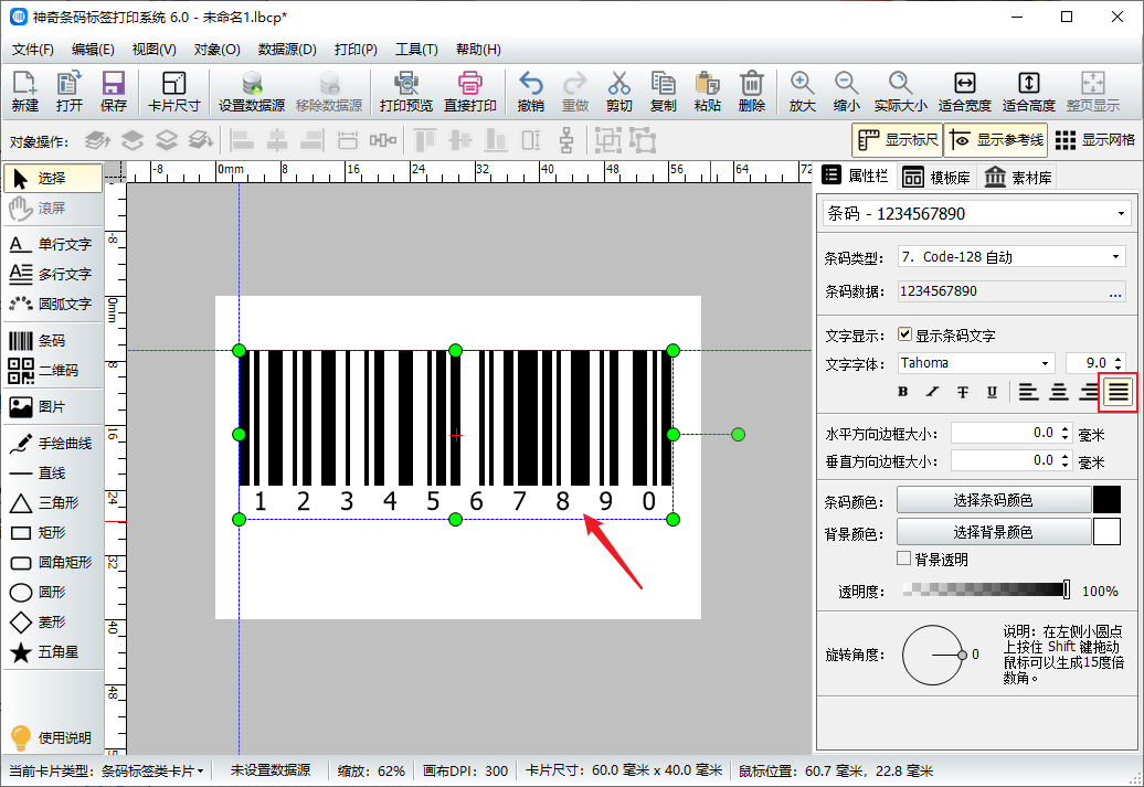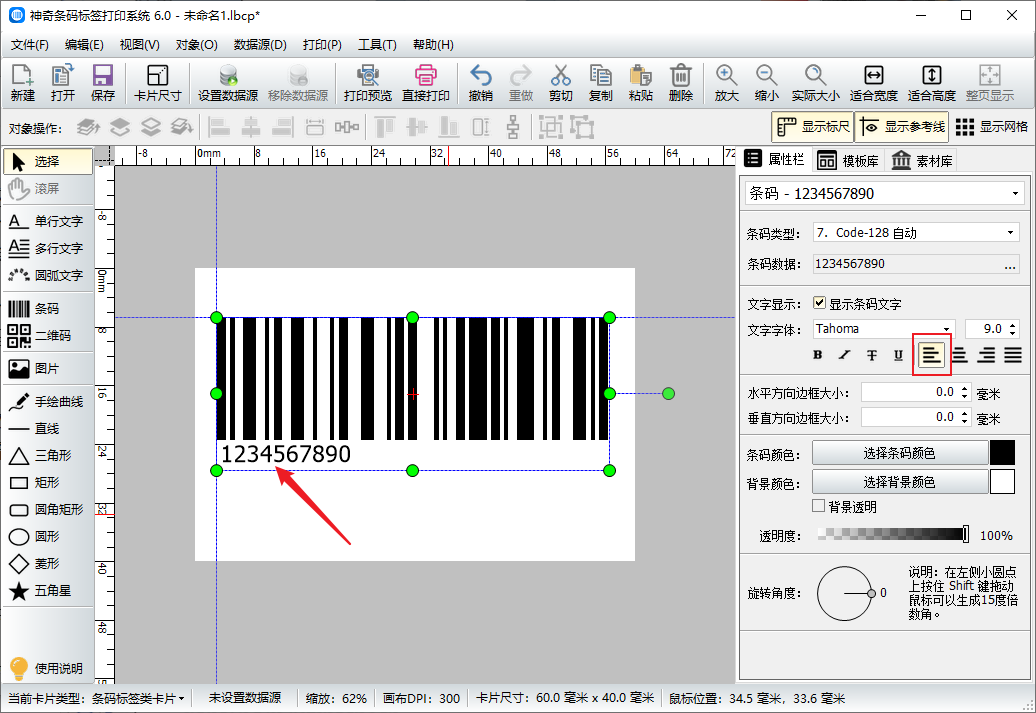 首先打开条码打印软件,新建一个文件,根据实际纸张设置标签尺寸。点击“条码”按钮,在软件中绘制一个条形码,可以看到条码数据默认是在条码下方居中显示的,点击软件右侧的左对齐按钮,数据就显示在条码的左侧了。