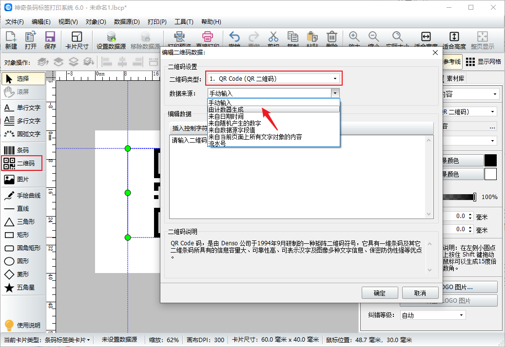 首先在条码软件中新建一个标签,设置标签的尺寸,标签的尺寸要和打印机里标签纸的尺寸保持一致。点击软件左侧的二维码按钮,在标签上添加一个二维码,在弹出的界面里设置二维码的类型,数据来源选择由计数器生成。