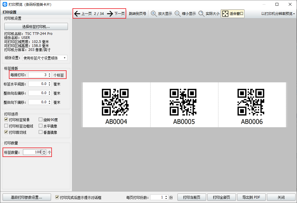 二维码生成后,点击打印预览,根据标签纸的规格设置每排打印的个数。点击界面上方的上一页和下一页可以查看二维码的生成情况。