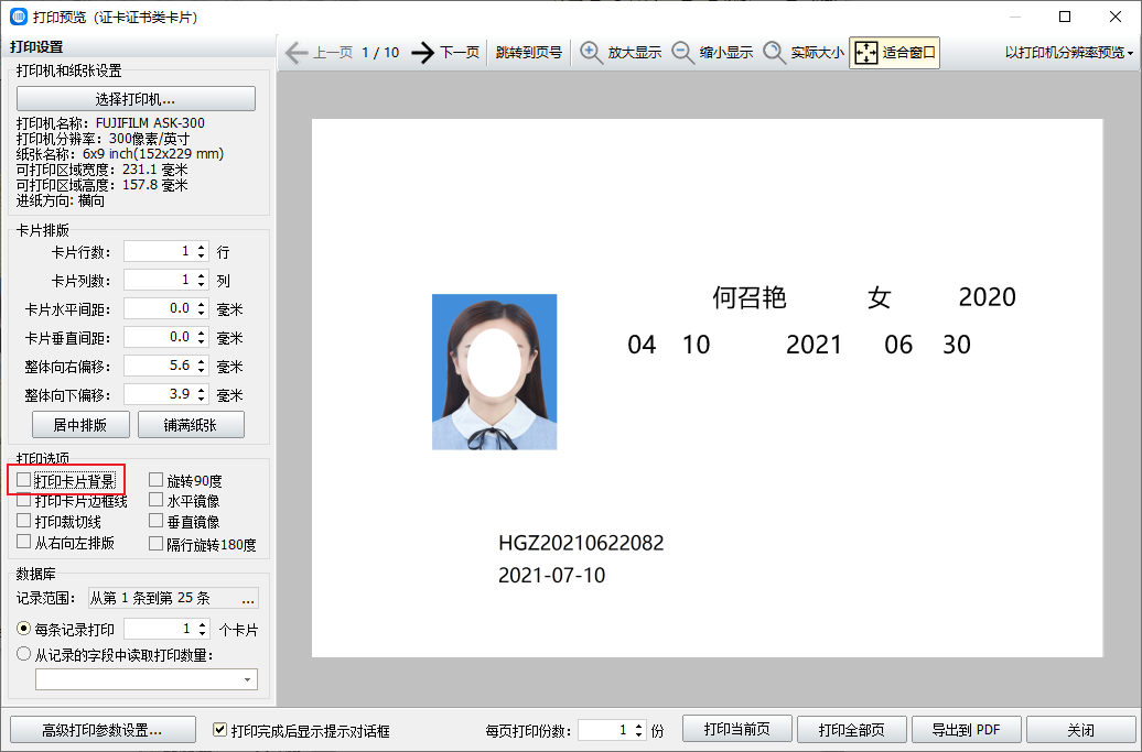 打印时,点击打印预览,在打印选项里把打印名片背景前面的√去掉。全部设置完成后就可以打印了。