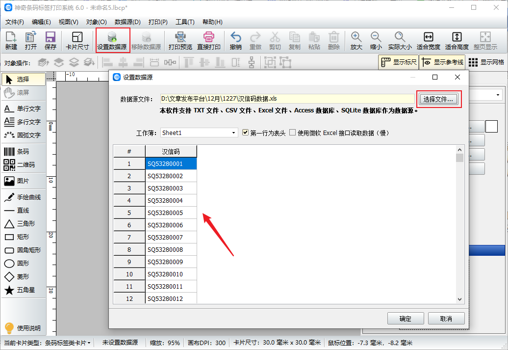 首先打开条码标签软件,新建一个标签并设置尺寸,这里要注意的是设置的尺寸要和打印机里的标签纸的尺寸保持一致。点击软件上方的“设置数据源”按钮,在弹出的界面中选择保存有汉信码数据的Excel文件,将其导入到软件中。