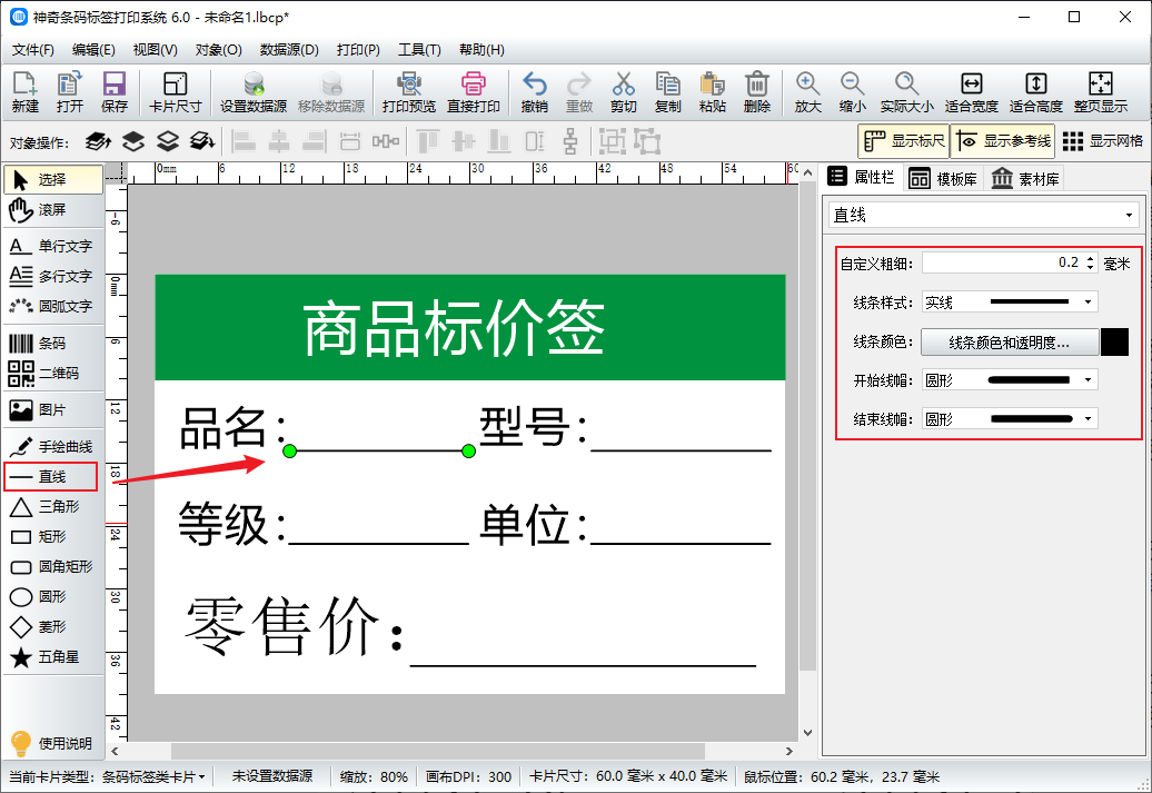 点击软件左侧的“直线”按钮,在相应的位置绘制直线,在软件右侧可以设置直线的粗细、样式、颜色等。