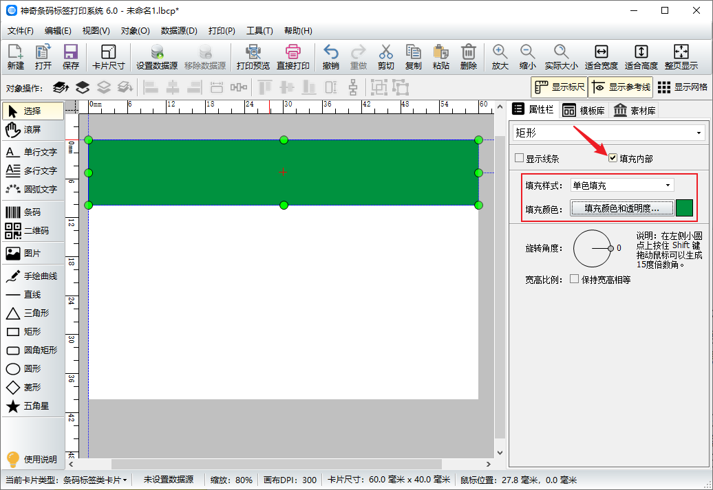 首先打开条码标签软件,新建一个标签,设置标签的尺寸,这里要注意的是标签的尺寸要和打印机里的标签纸的尺寸保持一致。点击软件左侧的“矩形”工具,在画布上绘制一个矩形,在软件右侧勾选填充内部,将填充样式设置为单色填充,然后点击填充颜色按钮,在拾色器中选择一个颜色。
