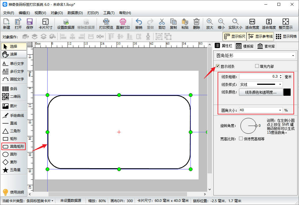 首先打开软件,新建一个标签,设置标签的尺寸,先在画布上绘制一个圆角矩形(或矩形)。在软件右侧勾选显示线条,并设置线条的粗细、样式和颜色等。还可以设置圆角的大小。
