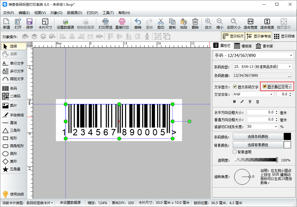 那么这种静区标志如何设置呢,在条码标签软件中,创建一个EAN 13条码,在右侧的条码属性里可以看到“显示静区符号”勾选框,勾选就可以在条码后显示,如果不勾选就不显示。