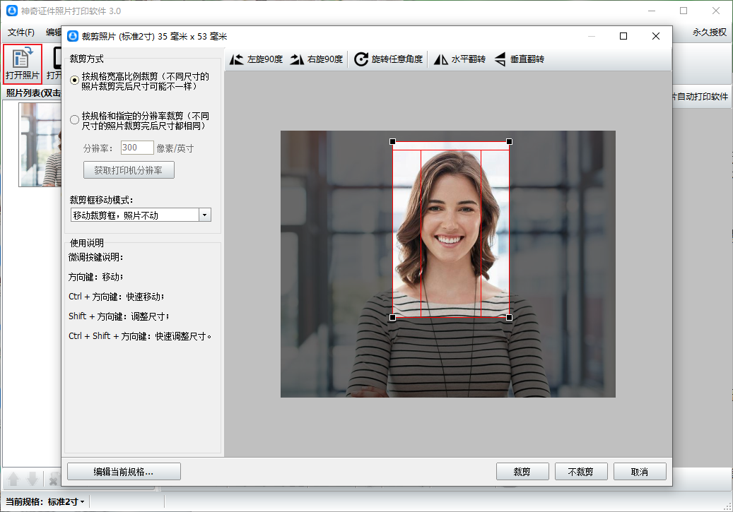 比如我们有一张照片,先将其变成证件照,在软件中点击【打开照片】,弹出一个裁剪照片的界面,拖拽裁剪框到合适的位置,点击【裁剪】即可。