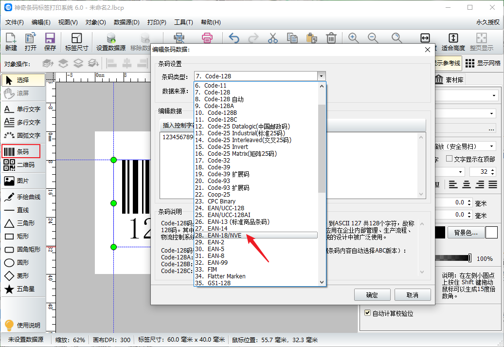 点击【条码】按钮,在标签上绘制一个条形码,在弹出的编辑界面选择条码的类型为EAN-18。