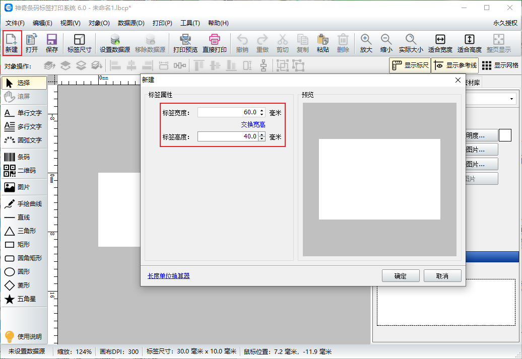 以上了解了EAN-18条形码的相关知识之后,下面我们看一下在条码标签软件中如何制作。首先,在软件中新建一个文件,设置文件的大小,尺寸可以根据标签纸的尺寸设置。