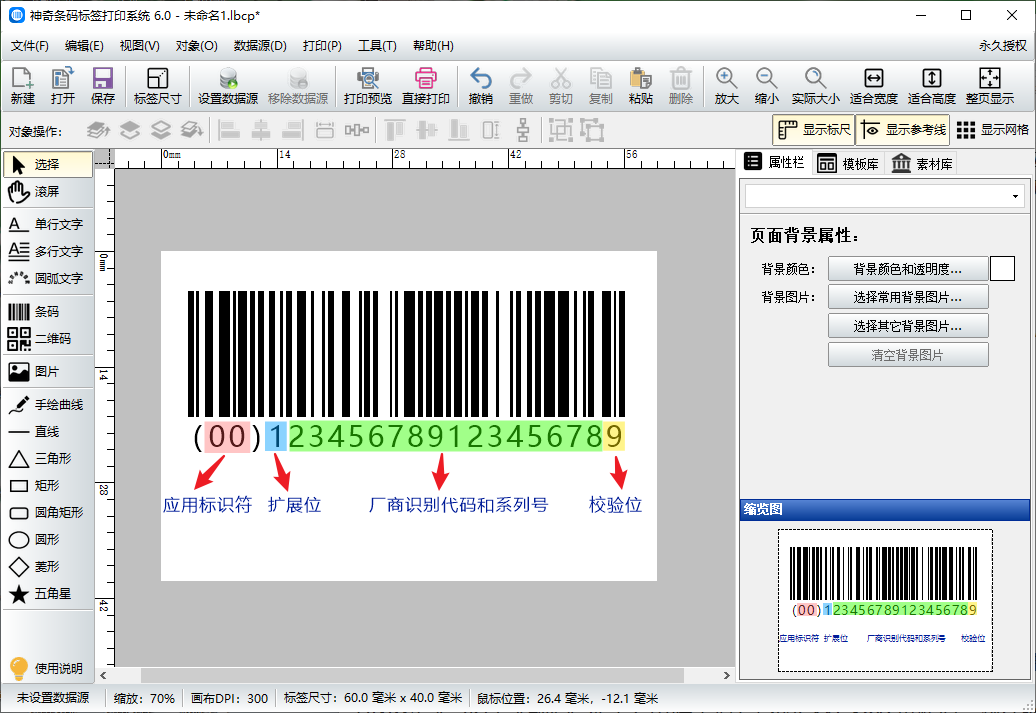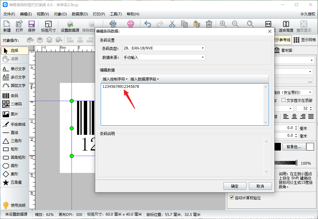 在编辑数据处输入条形码的数据,这里只需要输入17位数字就可以,最后一位校验数字软件会自动计算。
