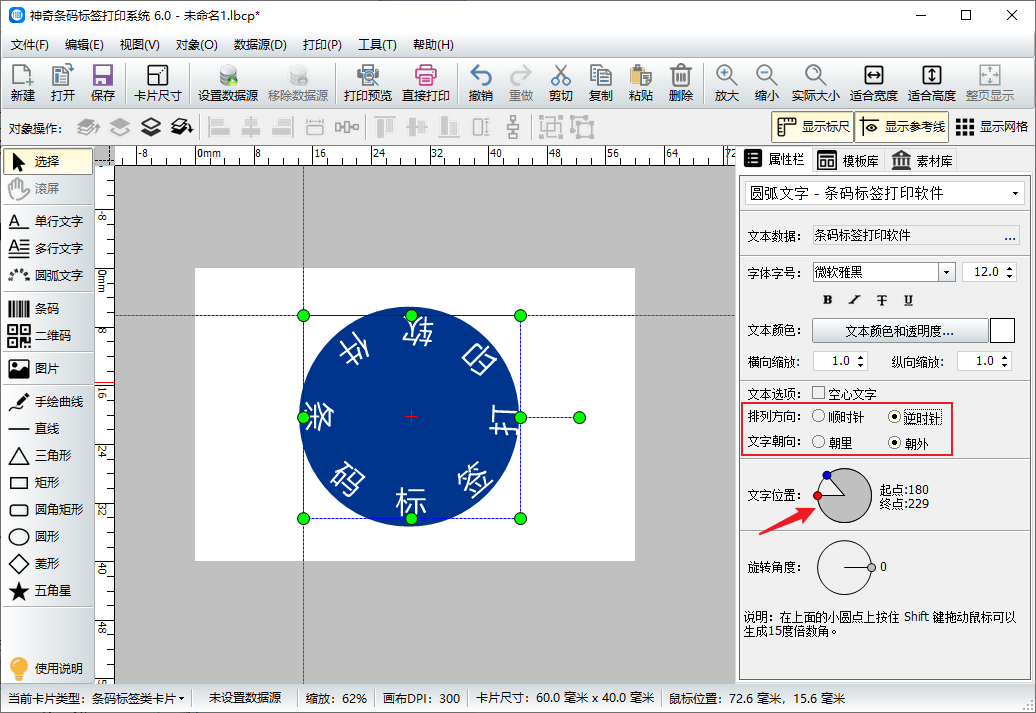 可以设置文字的排列方向、文字朝向。文字位置通过拖拽蓝色或红色的圆形来实现。
