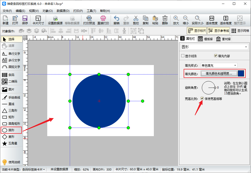 打开软件,选择圆形工具在画布上绘制一个圆,手动绘制的圆形可能不是特别标准,这时勾选保持宽高相等即可。可以设置圆形的填充颜色。