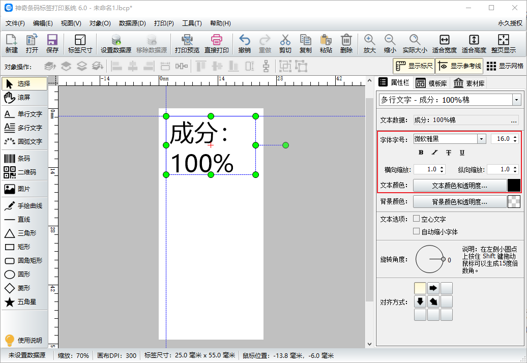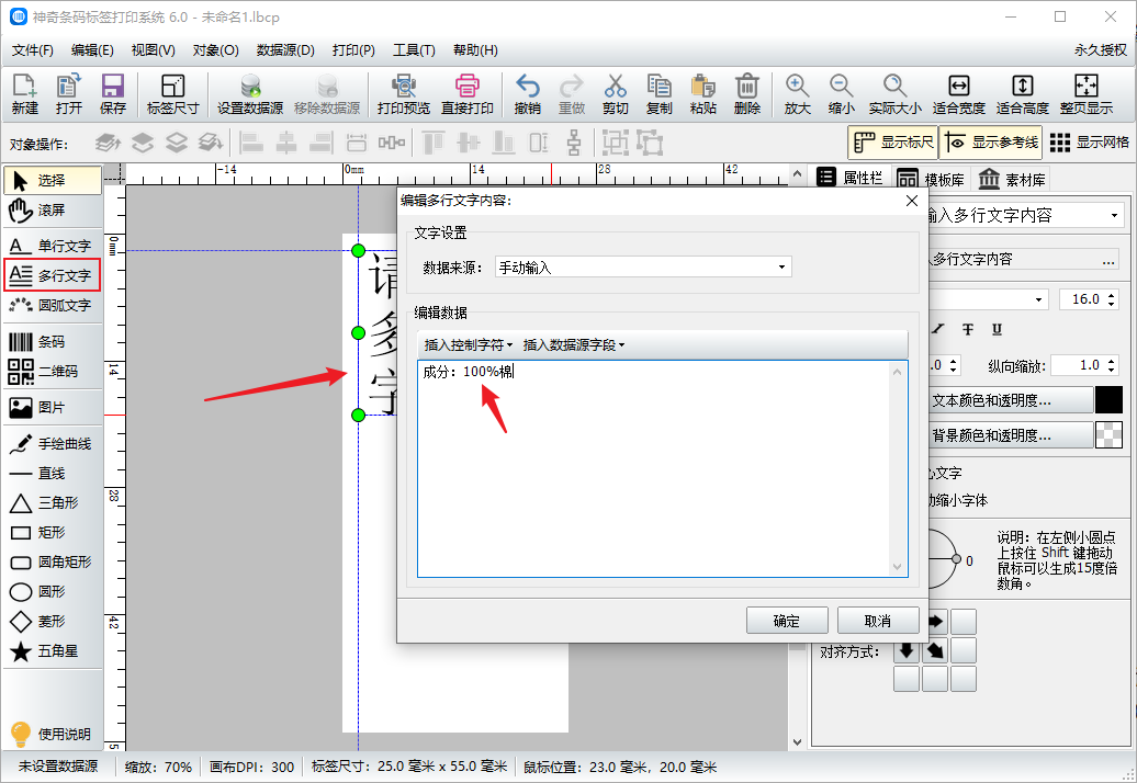 首先打开条码标签软件,新建一个标签,根据自己的需要设置标签的尺寸。在软件左侧选择“多行文字”工具,在标签上拖拽出一个文本框,输入文字内容,如下图所示: