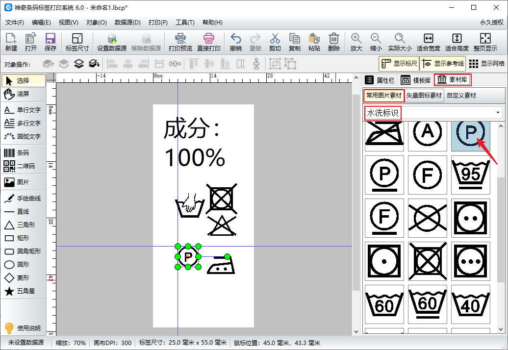在软件右侧点击【素材库】,选择常用图片素材,软件提供了各种类型的图标,从中选择水洗标识。在选中的图标上双击鼠标就可以添加到标签上。