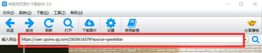 第二步:打开“神奇网页图片下载软件”,将上一步复制的网址复制到软件地址栏中,如下图所示: