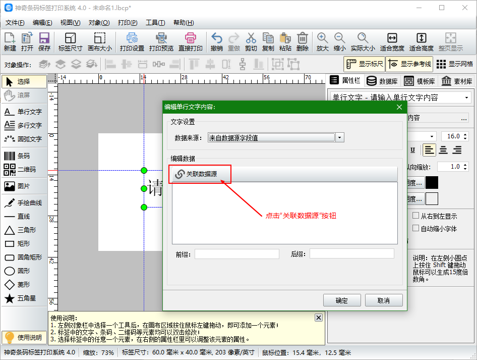 数据库导入完成后,接下来创建标签内容,首先创建一个单行文字,单击左侧功能列表中的“单行文字”,将鼠标移动到软件中间的白色区域上面,点击鼠标左键,将会出现如下界面: