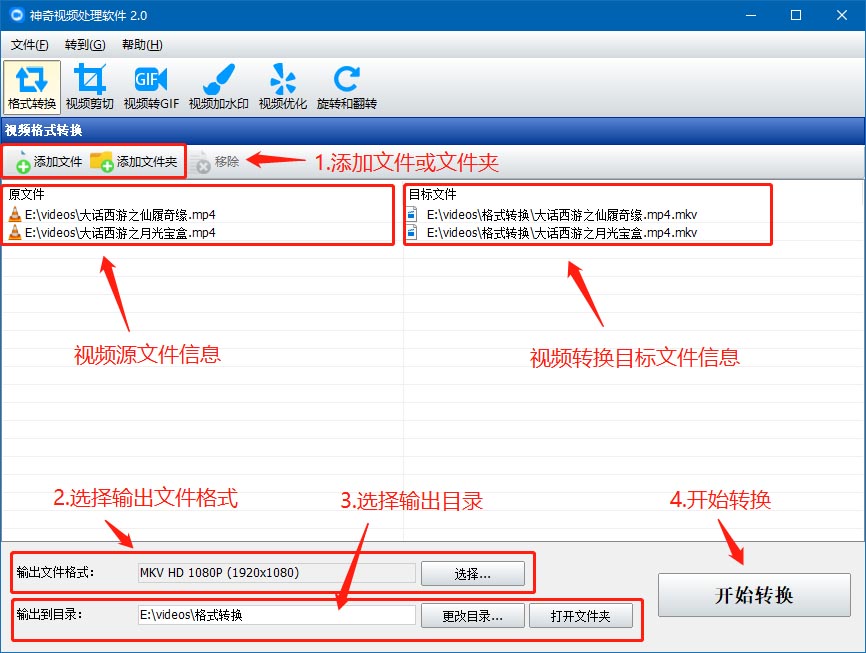第一步:添加视频文件,可选择多个同时转换,添加后列表中会显示源文件信息以及转换后的目标文件信息;