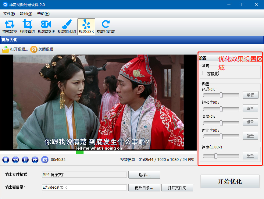 第二步:设置优化效果,效果可以实时体现在播放的视频界面当中;